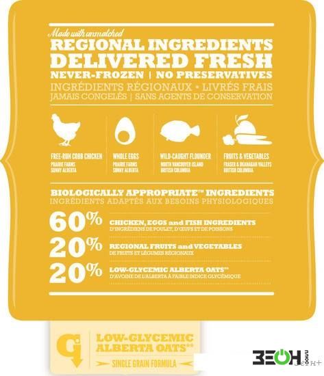 Ингредиентыбатат, бурая водоросль, вяленая на солнце люцерна, горох, дегидрированное мясо цыпленка, жир из сельди, клетчатка гороха, клюква, корень дудника, корень цикория, куриная печень, куриный жир, лаванда, листья перечной мяты, морковь, мясо цыпленка без костей, пастернак, плюс витамины и минеральные вещества, резаный овес, тыква, тыква мускатная, фенхель лекарственный, филе камбалы, цветы календулы, цельные яблоки и груши, цельные яйца, цельный картофель, черника, шпинат, ягоды можжевельника